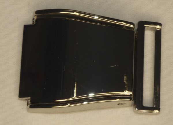 Boucle pour ceinture en métal avec système à soulever pour ouverture.