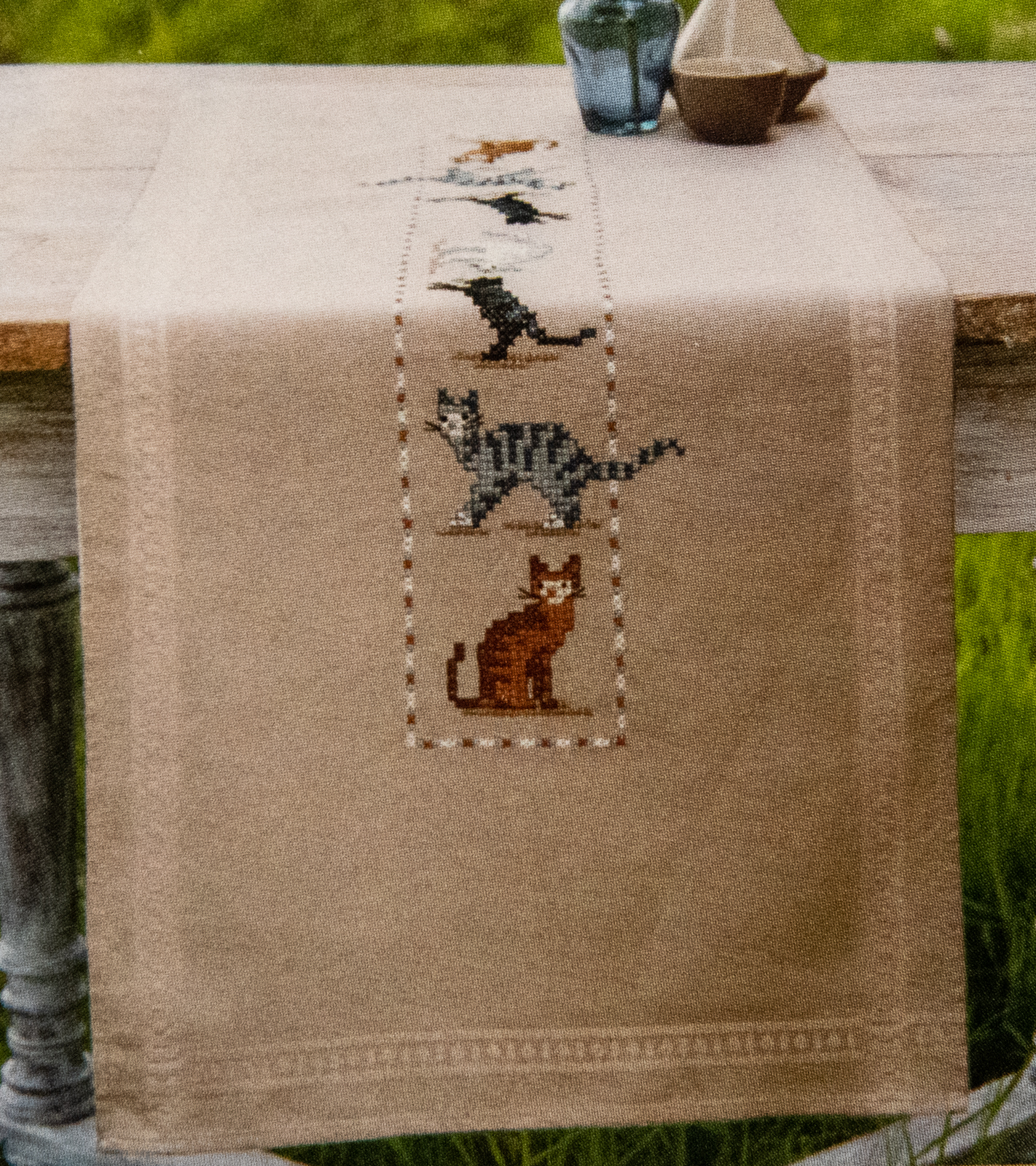 Chemin de table en toile de coton beige imprimée ourlée avec notice explicative.