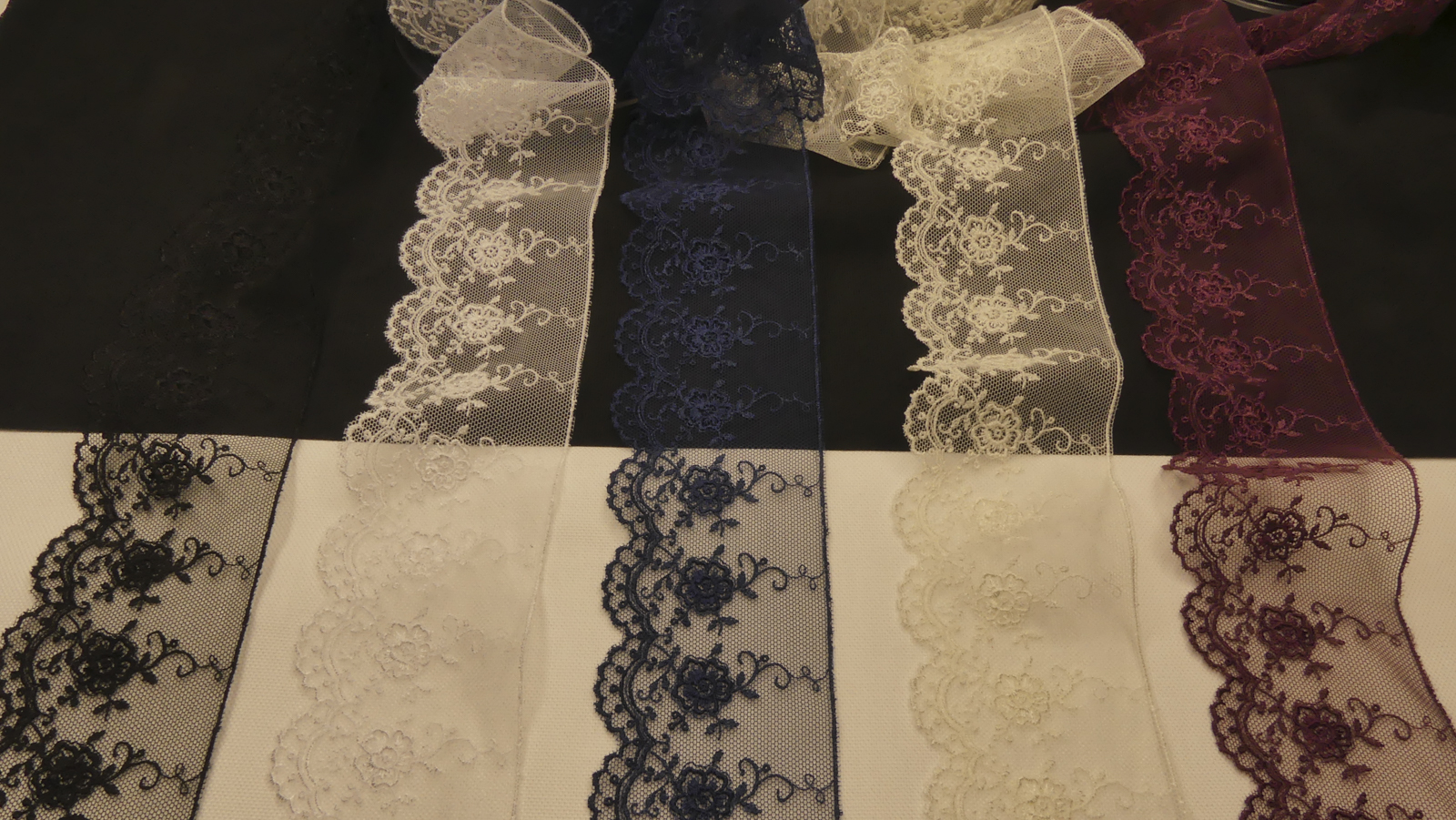 Dentelle fine existe en noir, marine, blanc ou écru. 100% polyester.