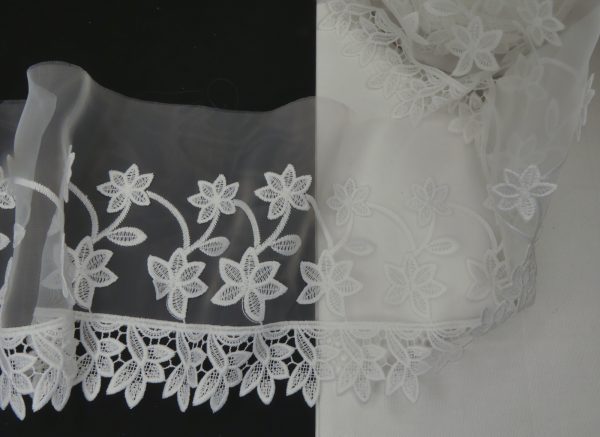 Dentelle fine blanche. 100% polyester.