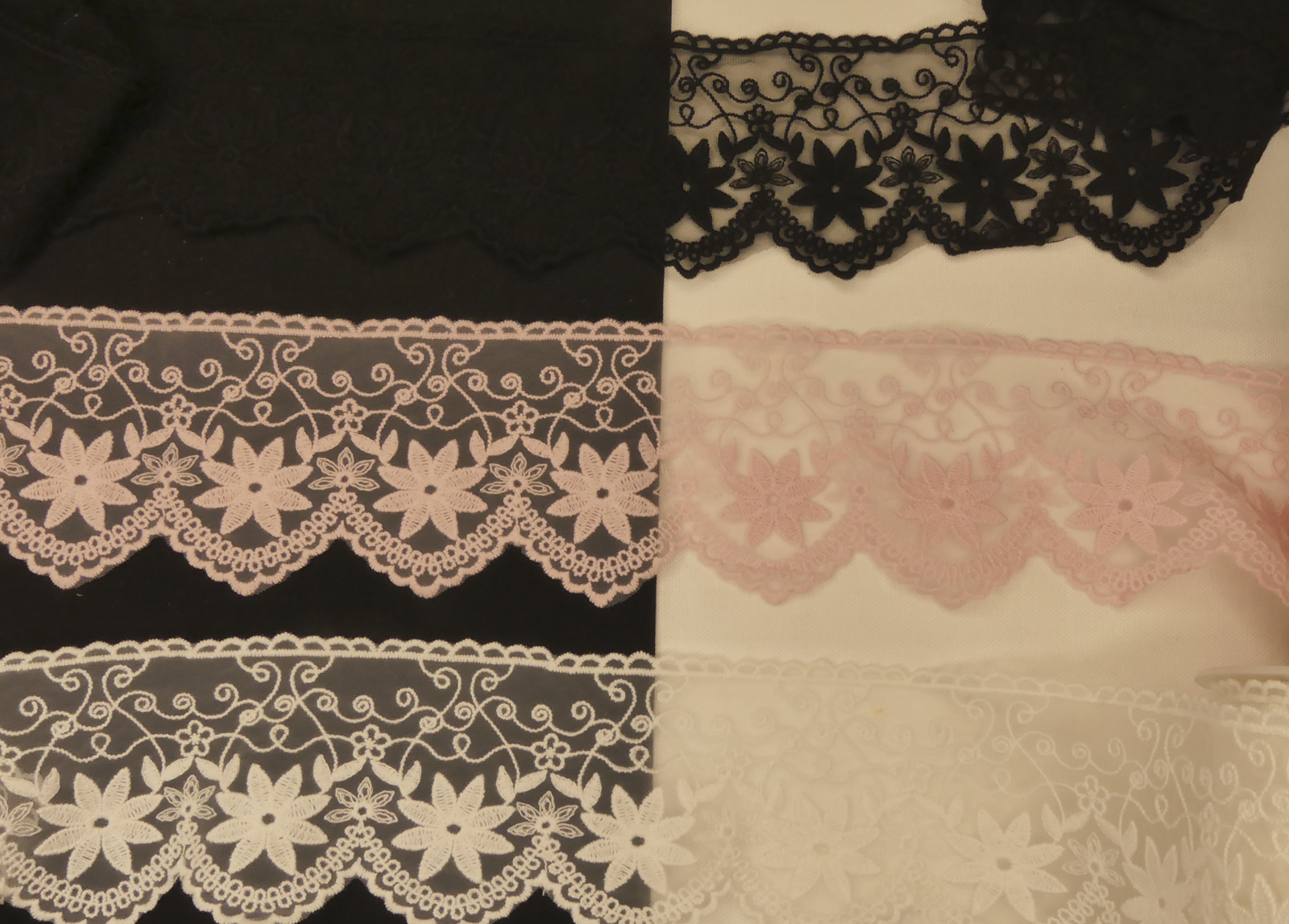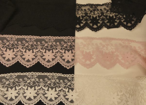 Dentelle fine existe en blanc rose ou noir. 100% polyester.