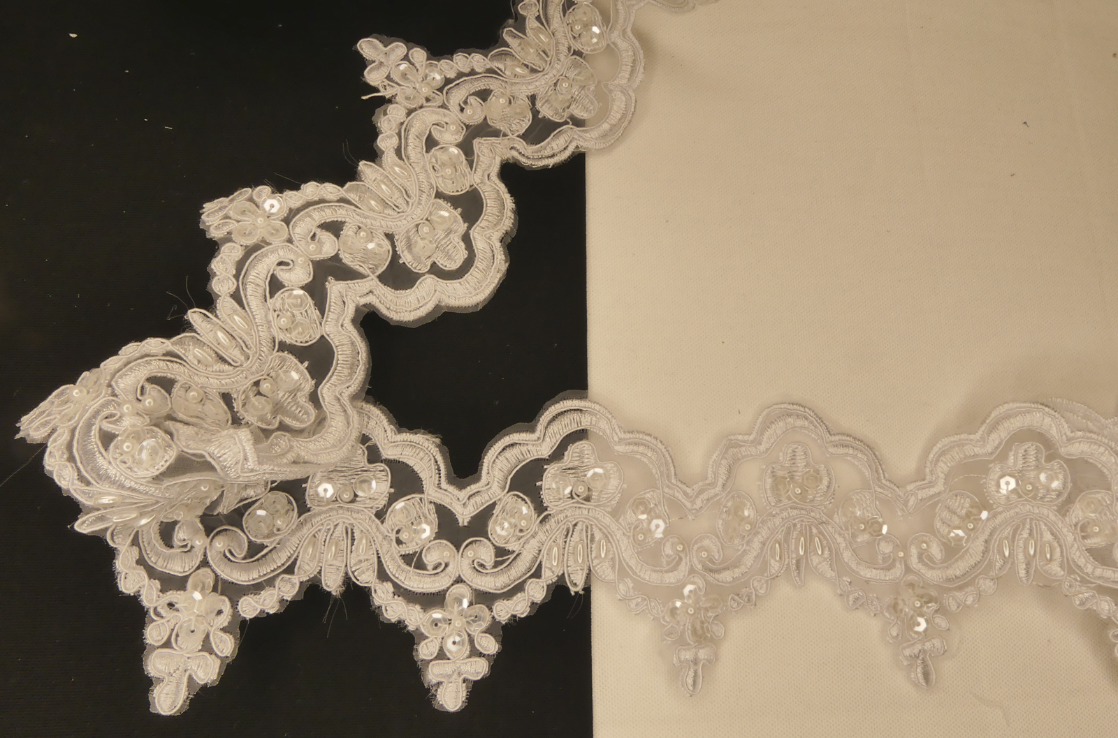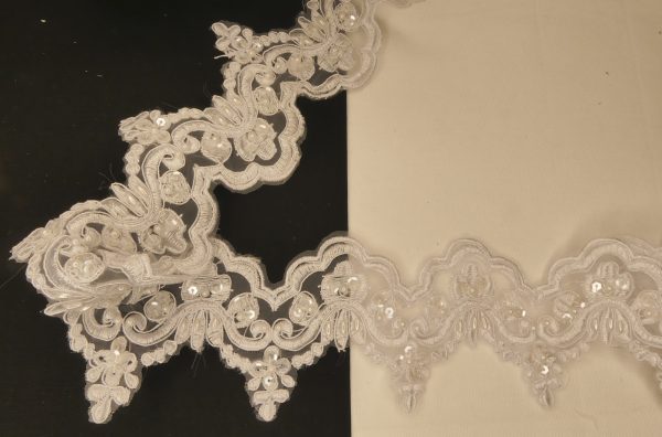 Dentelle avec incrustation de perles et paillettes blanches . 100% polyester.