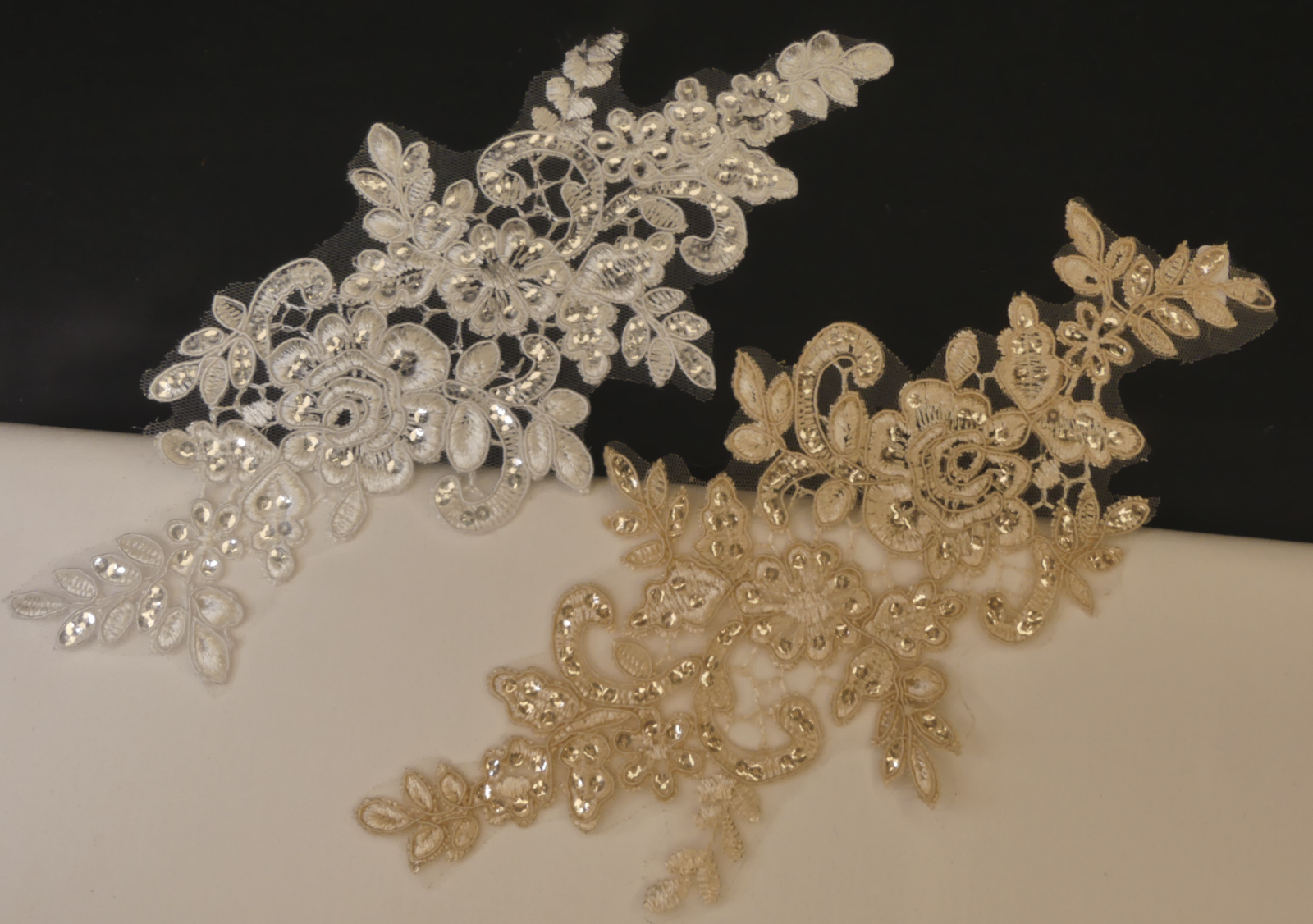 Fleurs brodées avec paillettes sur tulle, existe en blanc ou beige