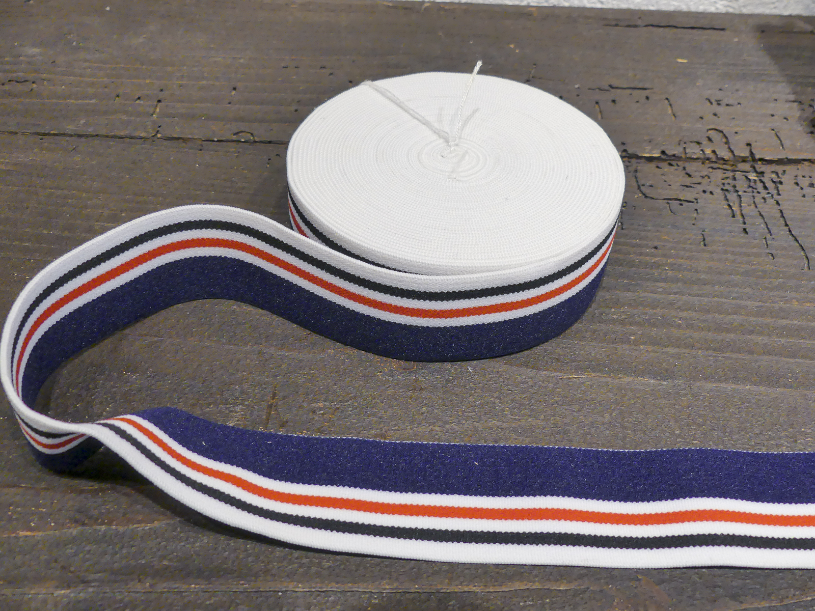 Elastique bleu marine  avec bande rouge, blanc et noir 100 % polyester