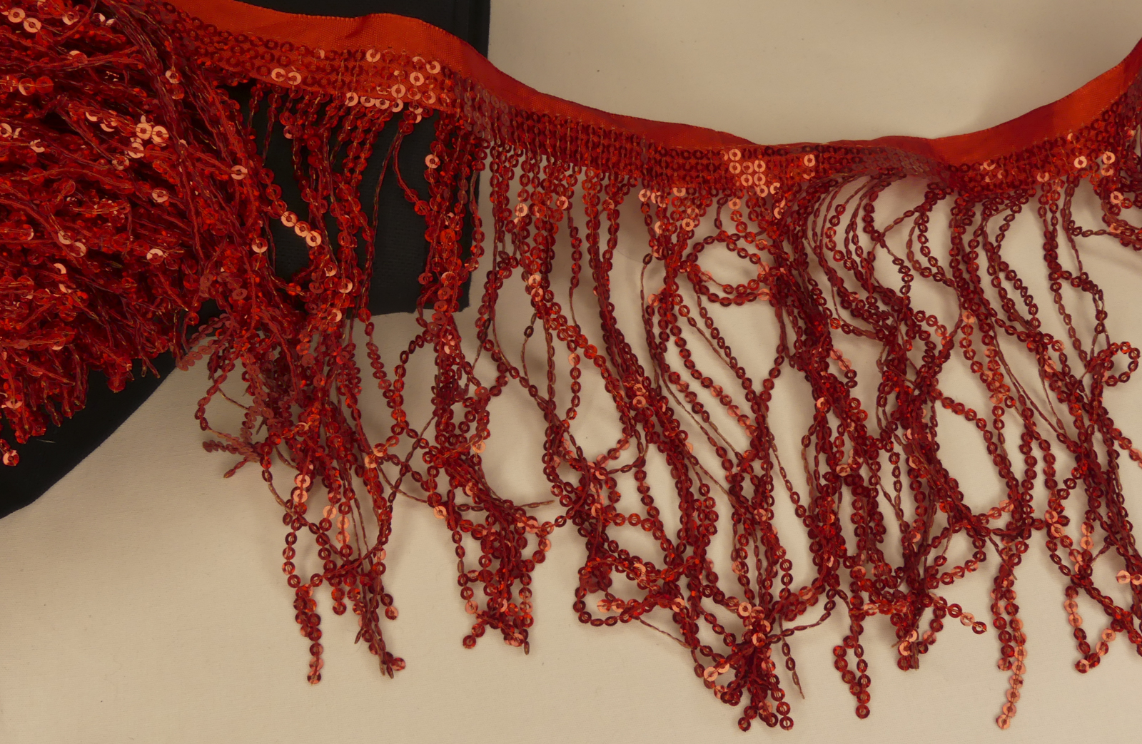 Frange en paillettes rouges cousues sur un ruban de satin. Lavage à la main