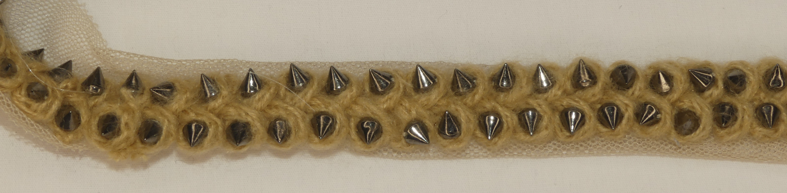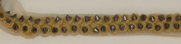 Galon beige avec clous en argent. 100% polyester.