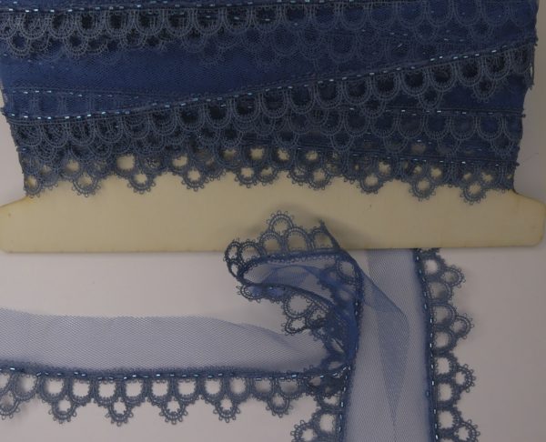 Galon dentelle et petites perles bleu gris 100% polyester.