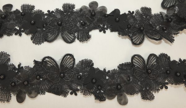 Galon dentelle fleur et papillon noir avec petite perle noir. 100% polyester.