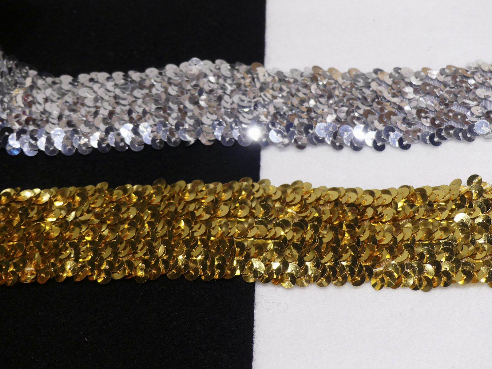Galon élastique avec paillettes existe en doré ou argenté 100 % polyester lavage à 30 °