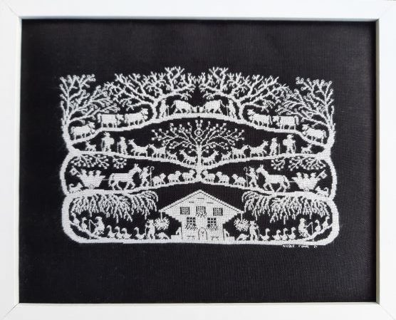 Kit au point de croix contenant diagramme, aiguille, fils et toile de lin noir