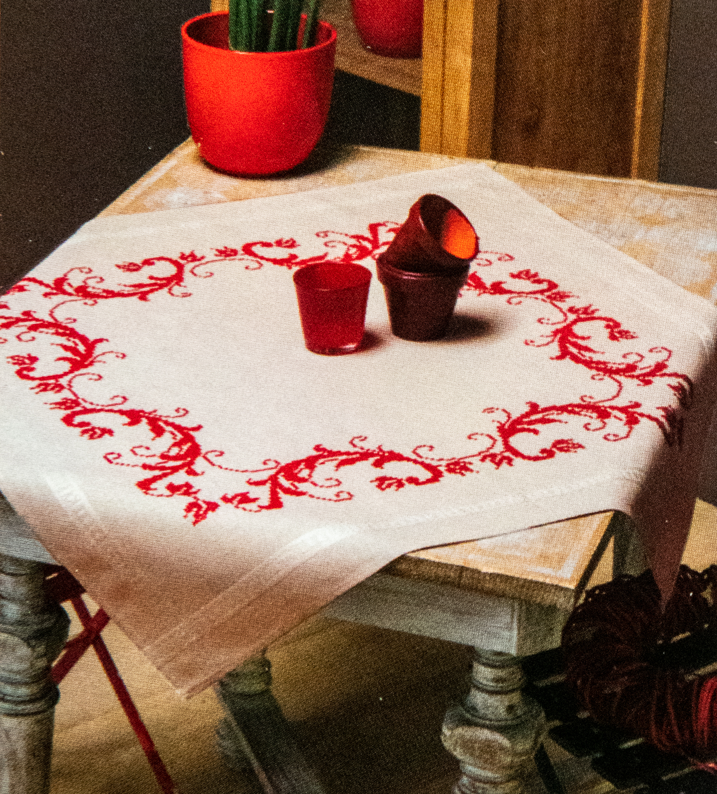 Nappe en toile de coton beige imprimée ourlée avec notice explicative.