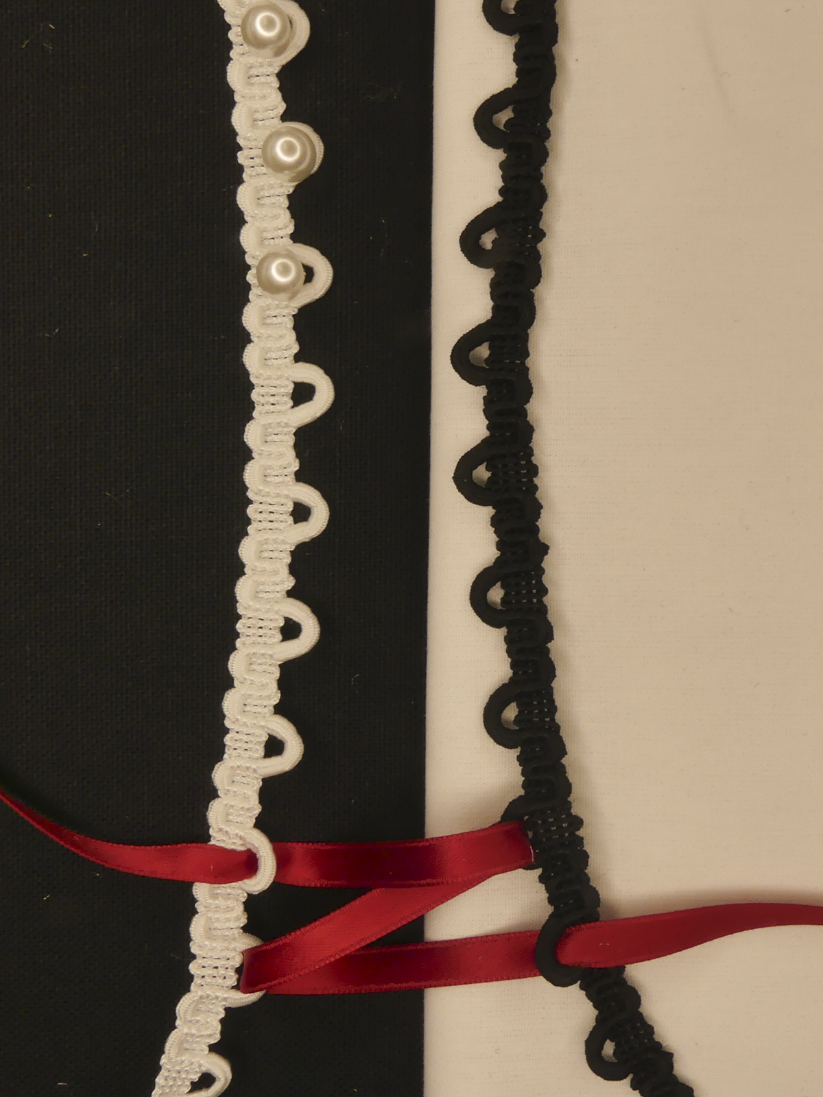 Ruban à bouclse pour robe ou corsage. Les boucles sont légèrement élastiques. 100% polyester existe en noir ou blanc