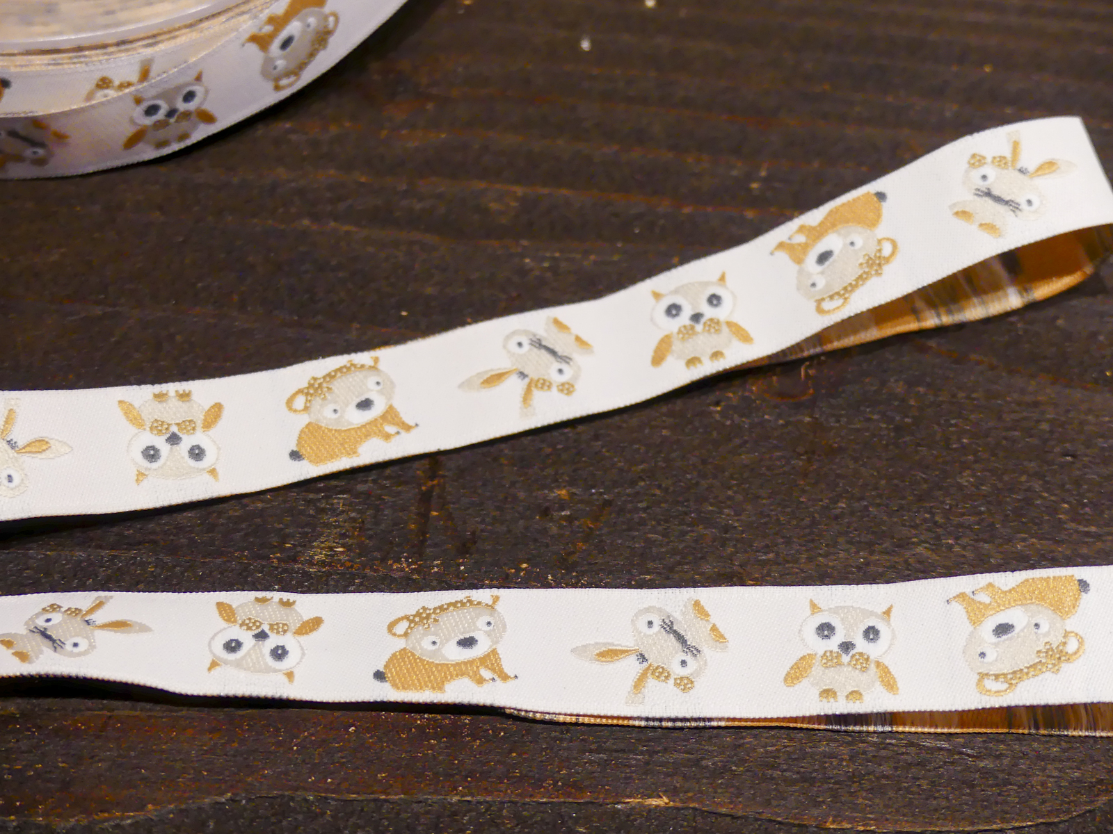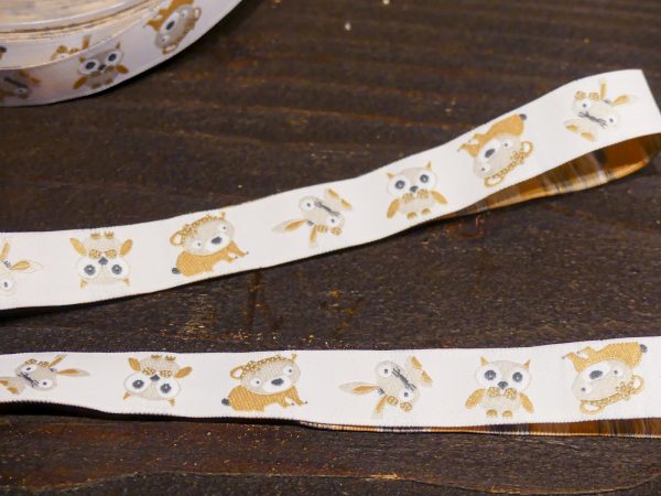 Ruban fond beige avec petits animaux. 100 % polyester lavage à 30°
