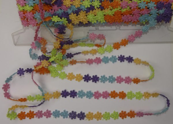 Ruban fleurs multicolores changeant de couleurs toute les deux fleurs. 100% polyester.