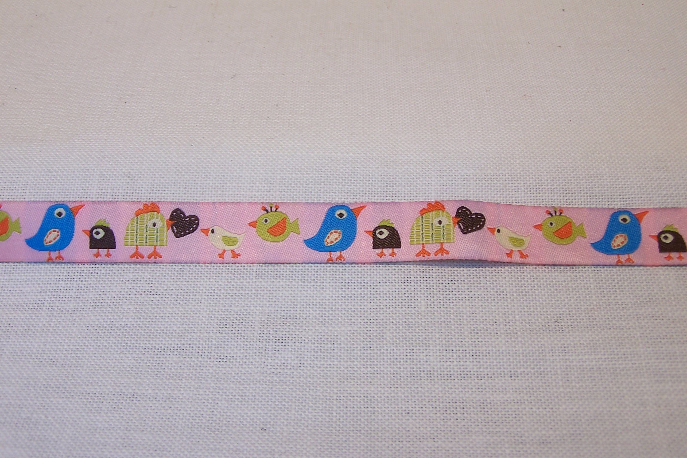 Ruban fond rose avec petits oiseaux . 100 % polyester