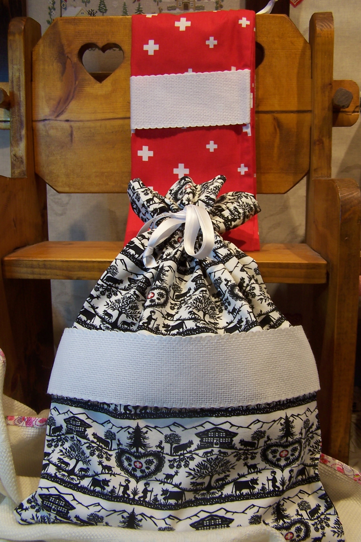 Sac poya ou croix Suisse avec bande aida de 5 cm 100 % jersey de coton. Dimension 35 X 45 cm lien en ruban de satin.
