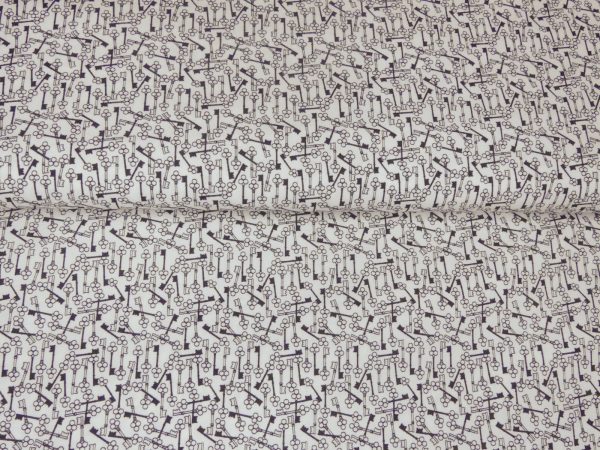 Tissu 100 % coton. Motif clefs noires sur fond blanc
