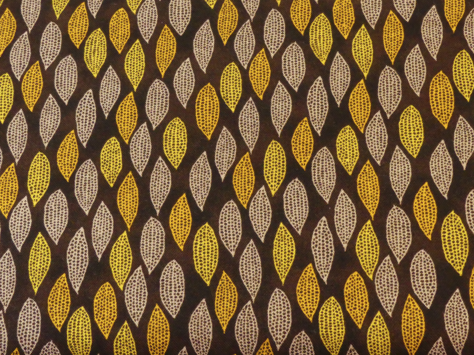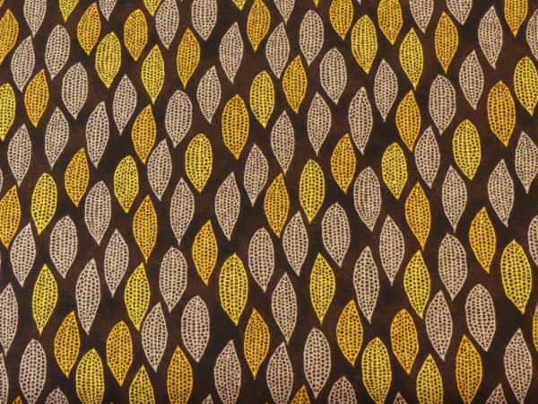 Tissu 100 % coton. Motif plume jaune et écru sur fond noir.