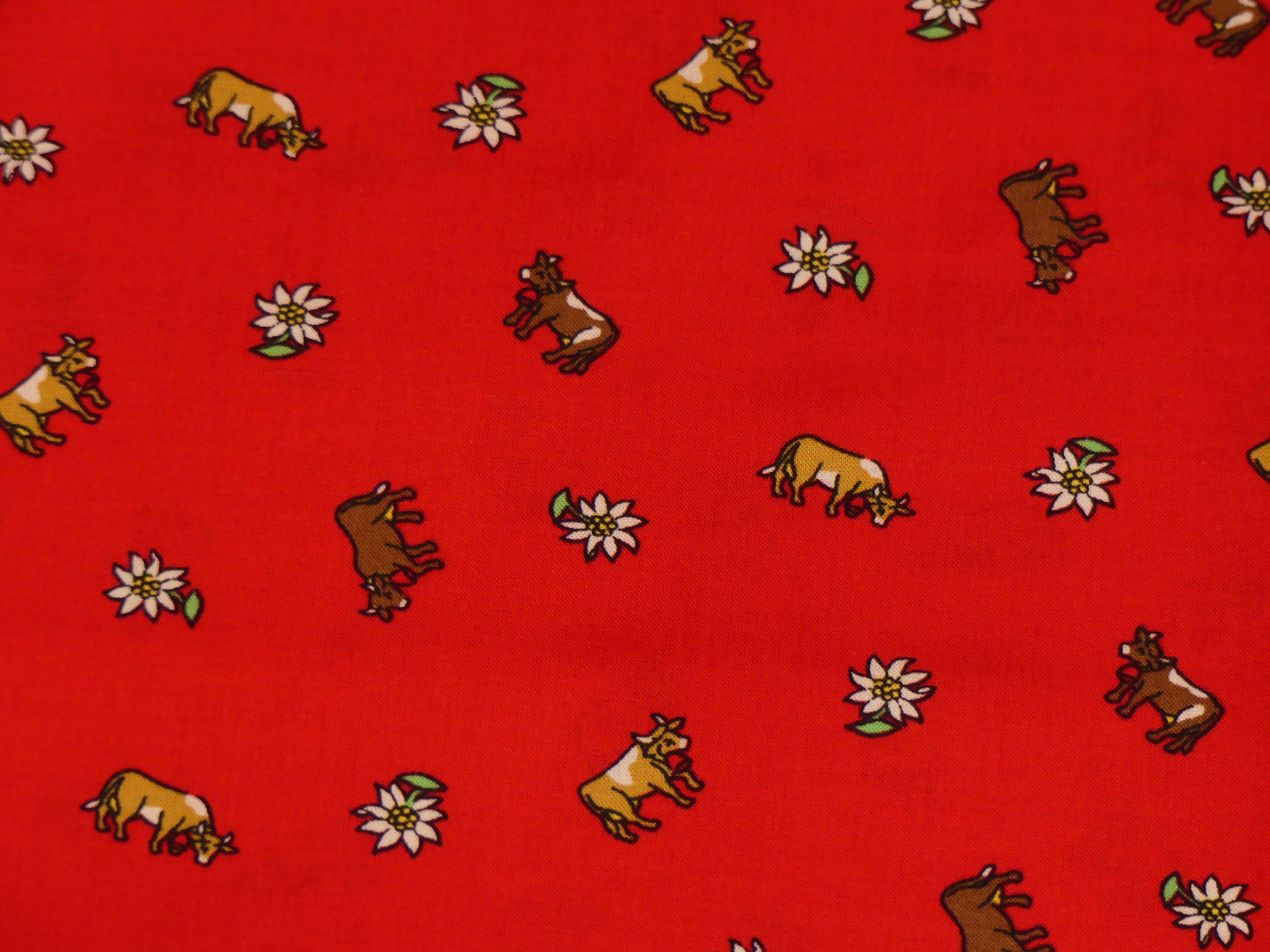Tissu 100 % coton. Motif edelweiss blanche et vache sur fond rouge