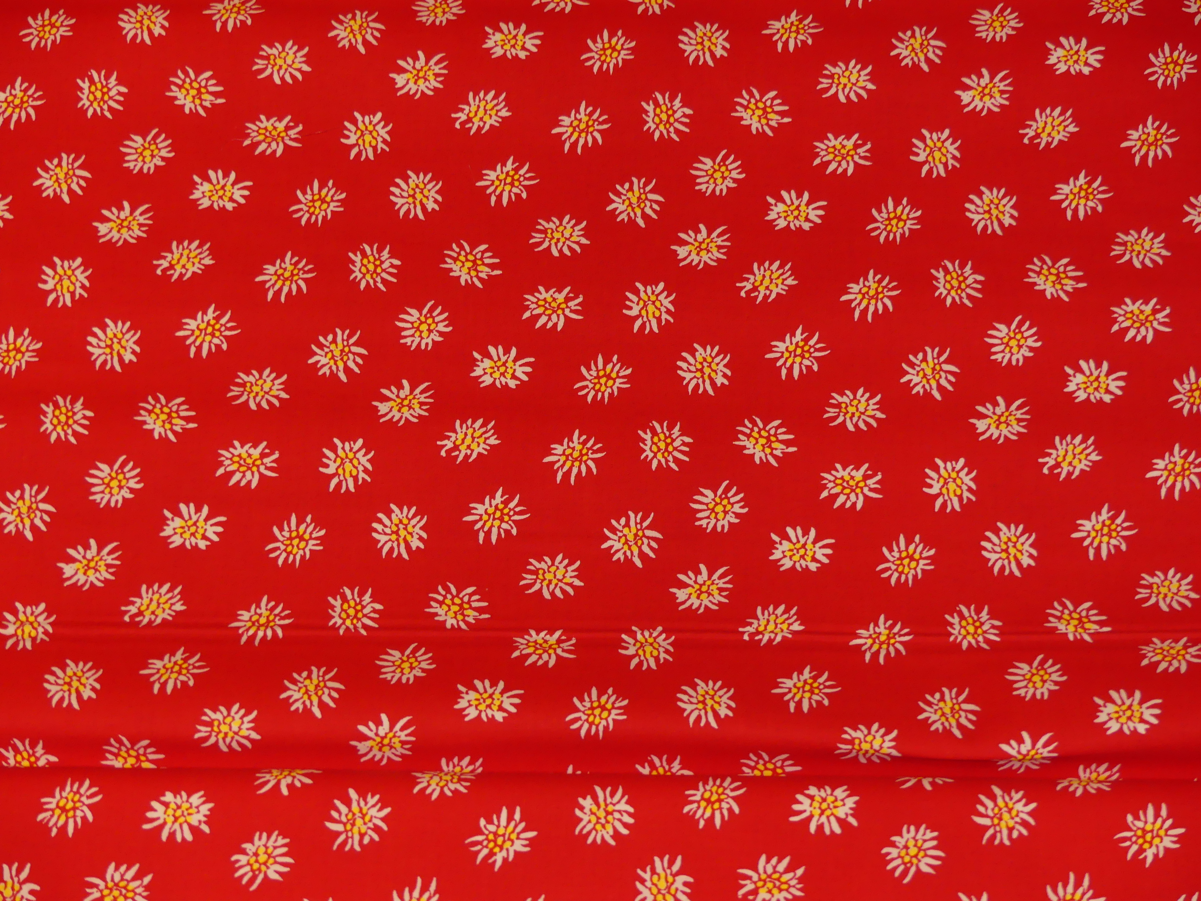 Tissu 100 % coton. Motif edelweiss blanche sur fond rouge