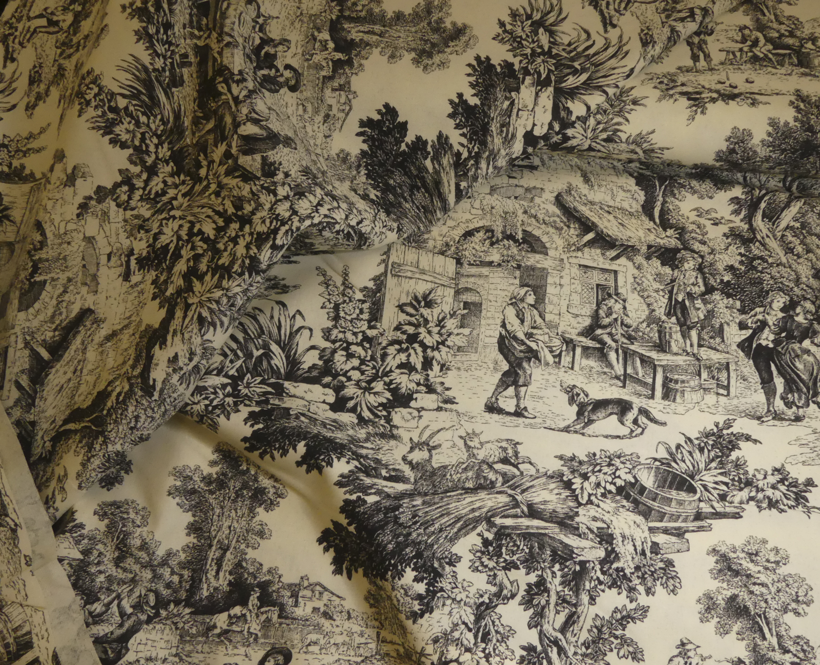 Tissu 100 % coton. Toile de jouy noire en 280 cm de large.